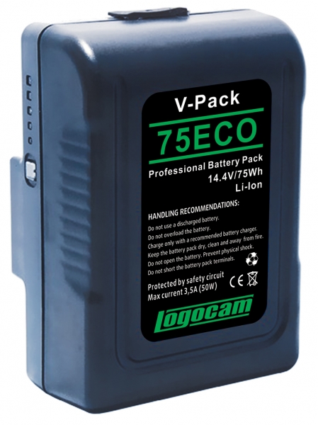 Logocam V-Pack 75 ECO - литий-ионная аккумуляторная батарея с номинальным напряжением 14, 4В и ёмкостью 75 Втч (5,2 Ач), предназначенная для использования с профессиональными видеокамерами SONY DSR-250, DSR-300, DSR-370, DSR-390, DSR-400, DSR-450, DSR-500, DSR-570 и др. Может применяться в качестве замены для батарей SONY cерий BP-L и BP-GL, а так же IDX Endura Li-Ion Batteries E-50, E-50S, E-80S, E-10. Оснащена разъемом PowerTap (AB 2 пин) для подключения внешней нагрузки. Батарея имеет российский сертификат соответствия. |