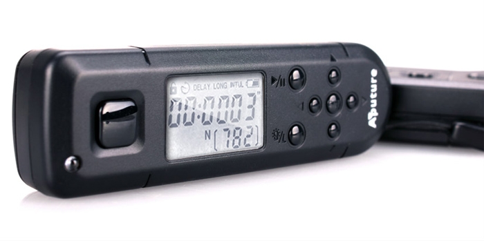 - ЖК Дисплей показывает всю необходимую информацию: таймер автоспуска, выдержку, интервал съемки, количество кадров, время и заряд батареи. ЖК дисплей также может отображать текущее время.