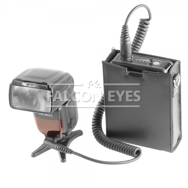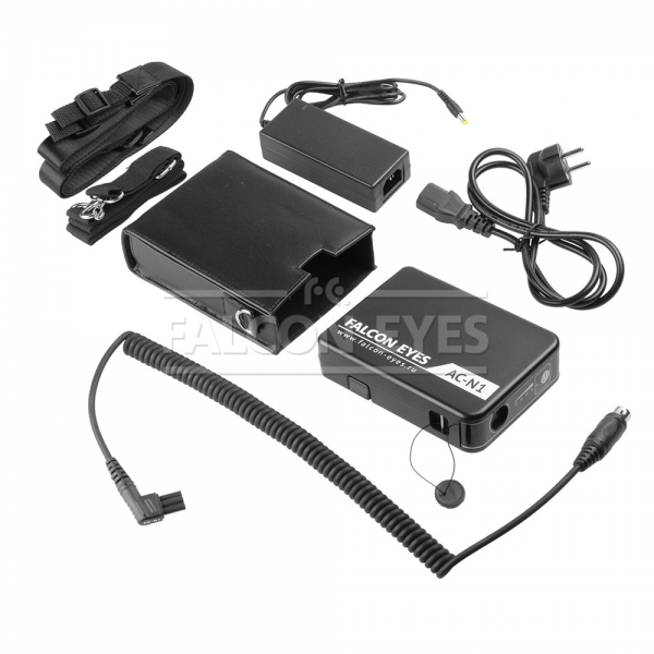 Компактный источник внешнего питания для накамерных вспышек FE-901N (для фотокамер Nikon), а также для вспышек Nikon Speedlight. AC-N1 обеспечивает до 1000 импульсов на одном заряде аккумулятора. С разъемом внешнего питания на вспышке AC-N1 соединяется витым шнуром. Кнопка включения прикрыта резиновым колпачком выведенным вровень с корпусом. Уровень заряда аккумулятора отображается пятью светодиодными индикаторами. Вход для шнура питания закрывается завинчивающимся колпачком, который в свою очередь соединен с одной из проушин на корпусе блока при помощи веревочки, что страхует от преждевременной потери колпачка. В AC-N1 используется съемный аккумулятор. Если вам необходимо действительно много снимать со вспышкой на различных мероприятиях, то можно вытащить севший аккумулятор и оставив его заряжаться, вставить в AC-N1 запасной и продолжить снимать! Этот источник внешнего питания выгодно отличается богатой комплектацией, заточенной под максимальное удобство переноски. Тут и плечевой и поясной ремни, и выполненный из кожзама мягкий кофр с D-образными металлическими кольцами для крепления ремней. На глянцевом пластиковом корпусе источника размещена металлическая клипса для крепления на поясной ремень, а также проушины для крепления плечевого ремня. Для статичного использования или хранения в нижней части корпуса AC-N1 размещены резиновые ножки. Из мелких, но приятных деталей, отметим выштамповку в виде смайлика на тыльной стороне устройства.