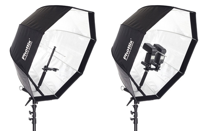 - Позволяет установить одну или несколько вспышек направленных в центр зонта, либо зонта-софтбокса Phottix Easy-Up, а также подобных софтбоксов других производителей для более равномерного распределения света.
