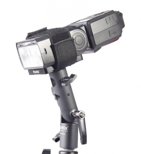 Держатель представляет собой плоское основание, к которому с помощью ремешка (контактной ленты-липучки) крепится вспышка.
