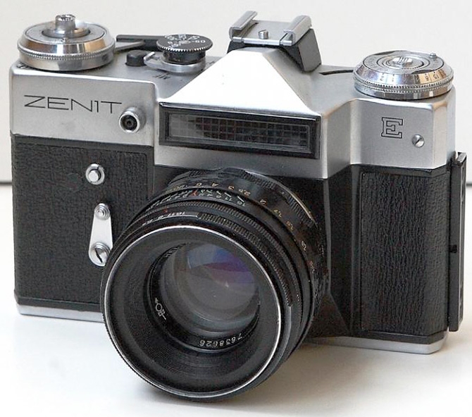 Фотоаппарат Зенит-Е – однообъективная зеркальная камера, использующая для выбора объекта съёмки видоискатель, в оптическую схему которого входит зеркало, перенаправляющее световой поток от объектива в окуляр видоискателя или на матовое стекло. Это самый массовый советский фотоаппарат, сконструированный на Красногорском механическом заводе (КМЗ). Этот фотоаппарат выпускался в 1965-1982 годах на заводе КМЗ, а с 1973 по 1986 на Оптико-механическом заводе в г. Вилейка (Белоруссия) Белорусского оптико-механического объединения (БелОМО). Буква Е в названии была присвоена этой модели в честь директора КМЗ Н. М. Егорова. Корпус фотоаппарата выполнен из алюминиевого сплава, задняя стенка открывается. Камера снабжена счетчиком кадров с ручной установкой первого кадра. Тип затвора данной модели - механический, шторно-щелевой, с горизонтальным движением матерчатых шторок. Фотоаппарат имеет встроенный несопряжённый экспонометр с селеновым фотоэлементом