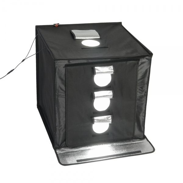 Фотобокс Falcon Eyes Light Cube 60 LED со светодиодным освещением Falcon Eyes Light Cube 60 LED - автономная мини-студия для фотографирования небольших и средних объектов, внутренний размер фотобокса 60х60х60 см. Используется в предметной съемке для печатных каталогов, интернет-магазинов, Конструкция разворачивается в квадратный легкий фотобокс и оборудована своим собственным источника света с цветовой температурой 5500К. Внутренние серебристые текстурированные стенки равномерно заполняют куб отраженным светом от двух светодиодных линеек (по 44 светодиода на каждой). Светодиодные линейки установлены на верхней крышке фотобокса, их можно легко переместить вдоль крышки благодаря системе липких лент (велкро). Монтаж конструкции осуществляется также с помощью липких лент, расположенных по периметру стенок. В сложенном виде фотобокс занимает мало места, складывается в кейс с ручкой. Light Cube 60 LED имеет откидную переднюю панель со встроенным съемочным окном 37х48 см и тремя отверстиями диаметром 11 см, а также верхний люк диаметром 12 см для съемки с верхнего ракурса. Фотобокс поставляется с черным, белым и оранжевым пластиковыми фонами для размещения разных цветных предметов.