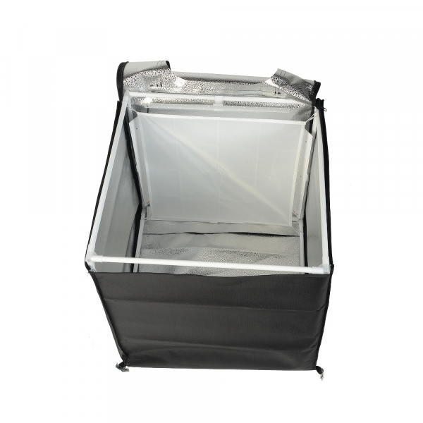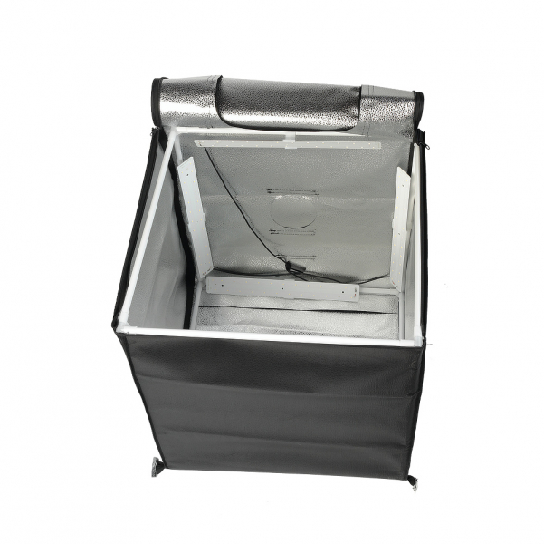 Для получения более рассеянного света можно использовать тканевый диффузор (рассеиватель) из комплекта, который крепится на петлях к металлическому каркасу. При таком освещении объекты фотографирования имеют более презентабельный вид, не отбрасывают жестких теней и рефлексов - соответственно снижается время на постобработку снимков. Яркость света светодиодов плавно регулируется двумя регуляторами мощности - диммерами, входящими в комплект поставки. Каждый из диммеров одновременно регулирует 2 планки света, прикрепленные к одному регулятору мощности.