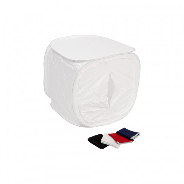 Фотобокс Godox DF-01 60cm Складной фотобокс Godox DF-01 предназначен для предметной и макросъемки, размер фотобокса 60 х 60 х 60 см. Материал фотобокса позволяет получить равномерное мягкое освещение, а изменение угла подсветки сделает возможным формирование любого светотеневого рисунка. Стенки фотобокса выполнены из светопропускающей синтетической ткани, каркасом являются металлические пружины. Съёмная передняя стенка фотобокса с прорезью для объектива. Фотобокс быстро разбирается и имеет небольшой вес, что делает его удобным для использования не только в студии, но и для выездных съемок. В комплекте имеется набор фонов (красный, синий, черный, белый) и чехол для транспортировки.