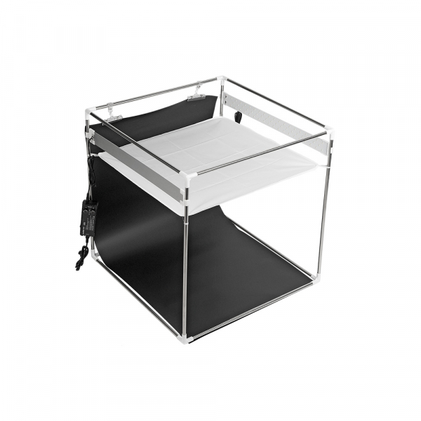 Фотобокс Godox LSD60 с LED подсветкой Конструкция фотобокса Фотобокс Godox LSD60 с LED подсветкой это готовая мини-студия для фотографирования небольших объектов, внутренний размер фотобокса 60×60×60 см. Используется в предметной съёмке: для печатных каталогов, интернет-магазинов и т. д. Компактность фотобокса в сложенном состоянии позволяет хранить его в любом шкафу. Также фотобокс отличается простотой сборки и разборки, использование инструмента для этого — исключено. Конструкция представляет собой трубчатый каркас с надетым на него кожухом с внутренними серебристыми отражающими поверхностями. На гранях кожуха фотобокса есть три отверстия закрытые клапанами на липучке. Два больших отверстия расположены на передней и верхней гранях фотобокса и предназначены для фотографирования объектов с разных ракурсов. Маленькое отверстие (на верхней грани) предназначено для заведения кабелей питания светодиодных линеек внутрь фотобокса. Фотографирование предметов также можно осуществлять полностью откинув переднюю грань фотобокса. Крепление светодиодных линеек производится за счёт пластиковых клипс (предусмотрены в комплекте) на верхние либо на вертикальные рёбра внутрь фотобокса (для крепления на вертикальные трубки и на горизонтальные предназначены разные клипсы). Для получения более рассеянного света, в комплекте предусмотрен тканевый светорассеиватель, фиксация которого осуществляется за счёт резиновых петель к трубчатому каркасу фотобокса. Для получения более качественного светотеневого рисунка — положение светорассеивателя можно регулировать по высоте. В комплекте предусмотрено два пластиковых полуматовых фона. Цвета фонов: чёрный и белый. Крепление фона к каркасу производится двумя комплектными прищепками. Освещение Освещение фотобокса осуществляется двумя мощными светодиодными линейками. С помощью кабеля со штекером, каждая линейка подключается к адаптеру питания Godox LSC2. Раздельная регулировка яркости линеек и их выключение производится за счёт двух диммеров, находящихся на корпусе адаптера питания. Суммарная мощность всех светодиодов составляет 40 Вт. Цветовая температура осветителей — 5800 К ± 200 К. Индекс цветопередачи CRI составляет более 96. Хранение и транспортировка Для хранения и транспортировки в комплекте предусмотрена мягкая нейлоновая сумка-чехол на молнии с ручками.