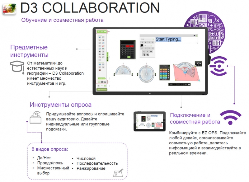 Интерактивная панель D3 G084-100GL 84" cерия G Серия интерактивных панелей G – отличная иллюстрация понятия «универсальность». Устройства этой серии находят свое применение в различных сферах — от офисных конференц-залов до школьных и университетских аудиторий, превращая работу и занятия в увлекательный интерактивный процесс. Это флагманская линейка, совместимая с полным спектром аксессуаров EZ Accessories. Картинка качества 4K и поддержка ОС Windows или Android позволяют проводить презентации и работать совместно. Функции сенсорного экранного меню (On Screen Display, OSD) и 4PIP («Картинка-в-картинке») помогут переключаться между источниками сигнала в любой момент времени на ваше усмотрение. А с поддержкой до 20 одновременных касаний вы сможете взаимодействовать с аудиторией, коллегами и учениками в удобном ключе. В комплекте: EZ Pen, EZ Buttons, D3 Board.