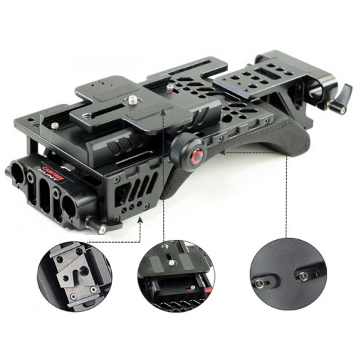 Система V-образных замков обеспечивает надежное крепление каркаса к штативу. Ее удобство также заключается в том, что она позволяет с легкостью снять каркас и продолжить вести съемку с рук. Удобный наплечник с мягкой противоскользящей подкладкой обеспечивает оператору максимальный комфорт во время работы.