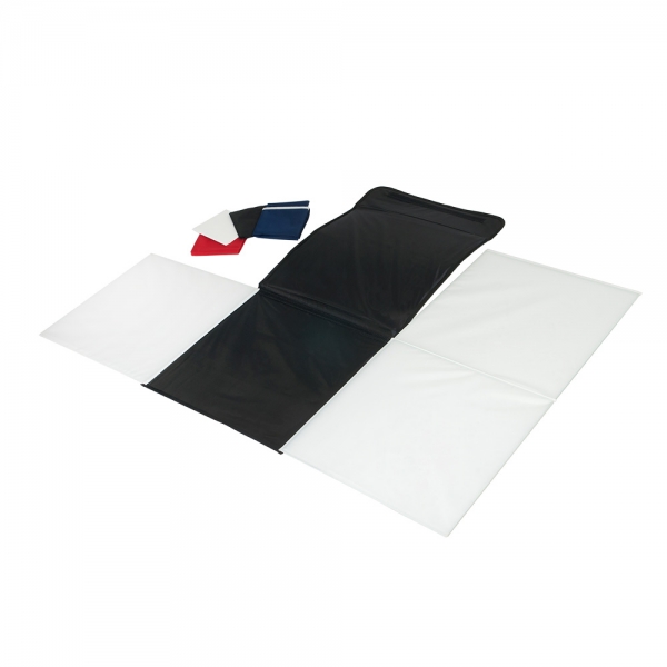 Матовые полупрозрачные стенки дают возможность бестеневого освещения объекта, а одновременное использование трех источников постоянного света позволяет правильно выстроить светотеневой рисунок. Благодаря своей конструкции, софтбокс быстро подготавливается к работе, ткань стенок остается ровной. В комплект входит 4 фона – черный, красный, синий и белый. Осветители со светодиодными лампами формируют яркий световой поток с цветовой температурой 5400К. Подготовка комплекта к съемке занимает буквально несколько минут, продолжайте снимать в то время, когда другие все еще несут свое оборудование.
