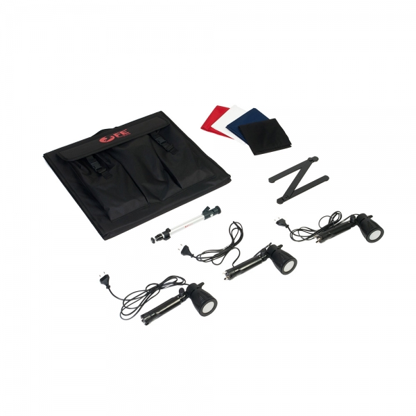 Комплект PBK-50AB-3LED является передвижной настольной мини-студией и идеально подходит для предметных съемок небольших изделий, ювелирных украшений, натюрмортов, макросъемки, также используется для съемок продукции интернет-магазинов. Комплект состоит из фотобокса (лайтбокса) размером 50х50х50 см, 4 сменных фонов, 3 светодиодных осветителей с выдвижными ножками и миништатива с шаровой головкой. Снаружи фотобокса расположены три кармана, в которых помещается весь комплект. В собранном виде комплект выглядит как портфель с ручкой и весит всего 3,4 кг.