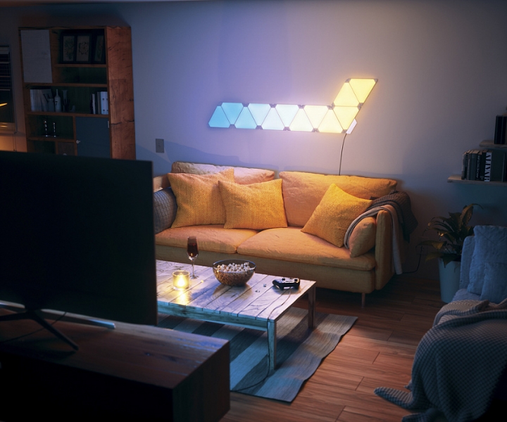 Комплект умных ламп Nanoleaf Aurora Smarter Kit 9 Panels Нет идеи для подарка? Хочется обновить интерьер? Не можете выбрать ночник или лампу? Умная система освещения Nanoleaf Aurora станет отличным ответом на любой из подобных вопросов. Уникальный набор из 9 светодиодных RGBW панелей — это передовое решение в световом оформлении интерьера, которое вы ещё не видели! Nanoleaf Aurora украсят любую комнату и создадут неповторимую атмосферу, наполненную светом и яркостью 16.7 миллионов цветов. Светодиодные модульные панели выполнены в форме равносторонних треугольников со сторонами 21 см. Благодаря уникальному креплению можно соединять треугольные ячейки разными гранями и создавать причудливые геометрические фигуры. Цвет каждой панели Aurora подбирается в приложении Nanoleaf App. Там же вы можете выбрать яркость и контрастность свечения.