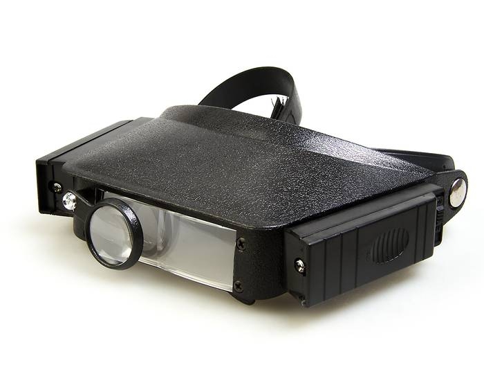 Применение: мелкий ремонт, радиотехника, при ювелирных работах и т. д. Увеличение: две прямоугольных линзы размером: 44×29 мм каждая плюс круглая поворотная линза диаметром 29 мм. Подсветка: две лампочки накаливания, размещенные в корпусе батарейных отсеков слева и справа от края линз. Питание: 4 батарейки типа AAA (по 2 на каждую лампочку), в комплект не входят. Выключатели находятся в задней части батарейных отсеков. Ремешок с липучкой позволяет закрепить лупу на голове наблюдателя. Устройство крепления позволяет поднимать козырек с линзами и оставлять его в фиксированном (поднятом) положении. Технические характеристики Базовое увеличение, крат: 1,8 Увеличение с поворотной линзой, крат: 3,7 Питание: 4 батарейки AAA Материал линз: пластик Материал корпуса: пластик Вес, г: 160 |