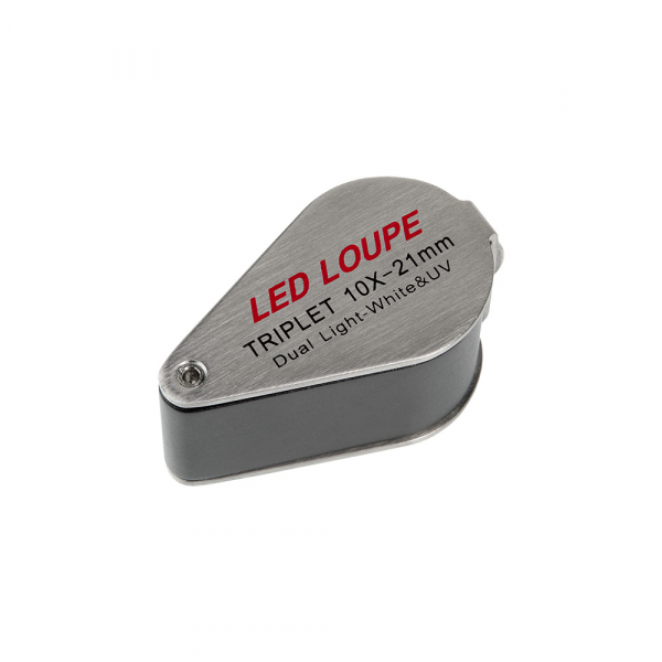 Лупа Veber 7802 (10х, 21мм) Корпус лупы и оправа изготовлены из металла. Сверху на оправе предусмотрен переключатель подсветки: подсветка поля зрения линзы и УФ подсветка. На нижней части оправы (вокруг линзы) расположены 6 УФ светодиодов и ещё один более мощный УФ светодиод расположен около батарейного отсека. Также на нижней части корпуса находится отсек для батарейки под винтовой крышкой. Шесть светодиодов белого света так же расположены вокруг линзы и имеют высокую яркость, тем самым обеспечивают комфортное наблюдение даже самых мелких деталей камней, ювелирных и других изделий, имеющих рельефную поверхность. Линза лупы изготовлена из оптического стекла и представляет собой склейку из трёх оптических элементов. Благодаря этому, создаваемое изображение абсолютно лишено окраски и искажения по краям поля зрения. Для замены батарейки в лупе, в комплектации предусмотрен фасонный металлический ключ. Для хранения и транспортировки — чехол из натуральной кожи, прошитой суровыми нитками, с бронзовой кнопкой — дань старинным ювелирным традициям. Также есть возможность носить данную лупу на шейном или кистевом ремне, для этого на корпусе лупы предусмотрено соответствующее ушко. Лупа Veber предназначена для чтения, рассматривания мелких предметов и деталей, например в филателии, нумизматике, геммологии.