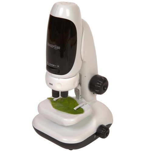 Цифровой микроскоп с предметным столиком выполнен в корпусе из инженерного пластика, поэтому отличается удобством, небольшим весом и высокой надежностью. Наблюдения можно вести как через съемную USB камеру Digital iCAMтм, так и при помощи встроенного оптического окуляра. Программное обеспечение позволяет в любой момент сделать фотографии или снять видео, чтобы потом сохранить отснятый материал на компьютере. Микроскоп комплектуется препаратом (образец волокон хлопка) для начала изучения микромира.
