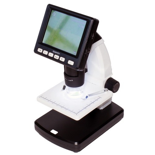 Мощный стационарный микроскоп, сочетающий отличную оптику и качественную камеру. Имеет устойчивую подставку, ручной механизм увеличения и фокусировки, поддержку записи фото и видео на карту MicroSD объемом до 32 Гб,автономное питание от встроенного аккумулятора и светодиодную подсветку. Позволяет определять размеры предметов. На большой ЖК-дисплей (8,9 см) выводится изображение объекта исследования. Для удобства просмотра по стандартному AV-интерфейсу изображение можно вывести на экран видеопроектора или телевизора. Данная модель микроскопа имеет ряд конструктивных особенностей: