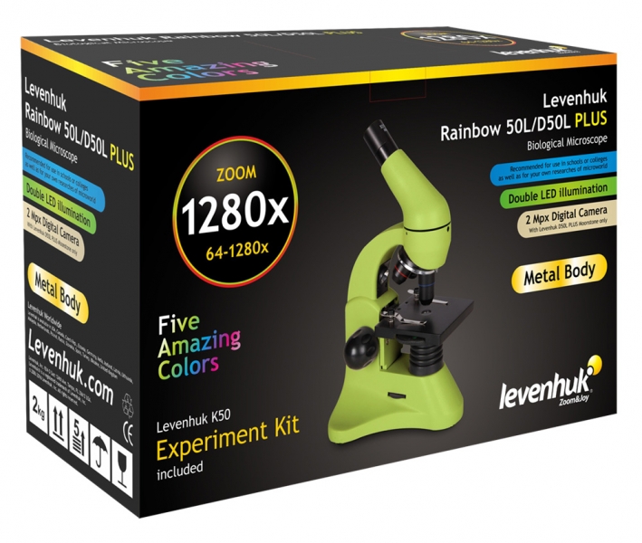 Современный дизайн, превосходная оптика, совершенная конструкция – все это микроскопы Levenhuk Rainbow 50L PLUS! Как и все модели Levenhuk Rainbow, эти микроскопы прекрасно подходят для начинающих исследователей. Каждая модель комплектуется набором для опытов Levenhuk K50, в котором есть все необходимое для знакомства с тайнами микромира. Благодаря улучшенной оптике и широкому диапазону увеличений микроскопы Levenhuk Rainbow 50L PLUS будут полезны и более опытным пользователям, например студентам-биологам или даже сотрудникам исследовательских лабораторий. Среди достоинств этих микроскопов стоит отметить просветленную оптику и универсальную подсветку, благодаря которой можно изучать прозрачные, непрозрачные и полупрозрачные микропрепараты. Главная отличительная черта серии 50L PLUS – самая высокая кратность среди всего семейства Levenhuk Rainbow. Благодаря качественной линзе Барлоу эти микроскопы позволяют исследовать препараты с увеличениями 64, 128, 160, 320, 640 и даже 1280 крат! Микроскопы Levenhuk Rainbow 50L PLUS комплектуются подпружиненными объективами – если при фокусировке задеть таким объективом препарат, особая конструкция убережет оптику от поломки. Надежные металлические корпуса способны выдержать даже очень частое применение – эти микроскопы можно использовать на школьных занятиях по биологии или для работы в лабораториях. Все модели Levenhuk Rainbow 50L PLUS поставляются в прочных пластиковых кейсах, которые защищают приборы от пыли и механических повреждений. Модель D50L PLUS с цифровой камерой заинтересует всех любителей современных технологий. Камера позволяет сохранять фотографии препаратов и записывать видеоролики – благодаря этому делиться результатами своих исследований с друзьями и коллегами очень просто. Модели серии Levenhuk Rainbow 50L PLUS выпускаются в пяти ярких цветах – вы без труда выберете свой идеальный микроскоп.