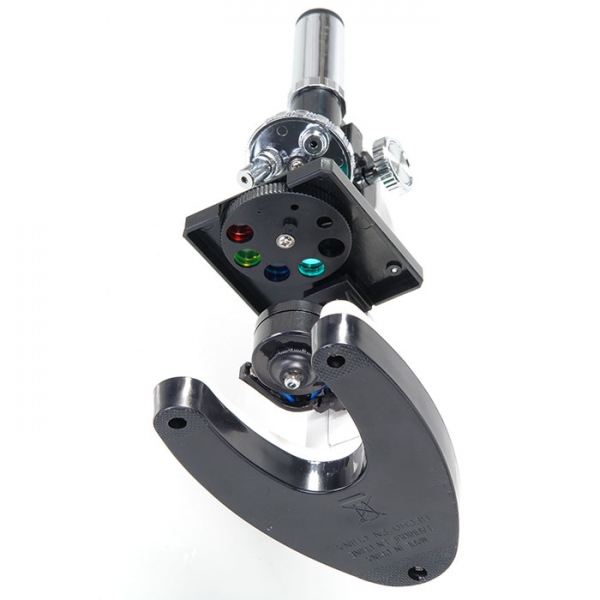 Универсальная система освещения – зеркало и лампочка. Лампа размещена на обратной стороне зеркала и включается автоматически при перевороте зеркала (батарейки устанавливаются в основание микроскопа, в комплект не входят). Такая система подсветки обеспечит возможность использования микроскопа не только в хорошо освещенном помещении, но и в сумерках в походных условиях. Четыре фильтра и диафрагмы, расположенные на диске под предметным столиком, сделают освещение исследуемого объекта наиболее выигрышным для наблюдений. Весь комплект оборудования упакован в жесткий кейс из двойного пластика с удобной ручкой – это позволит взять микроскоп с собой в путешествие - микроскоп не будет поврежден и препараты не перепутаются.