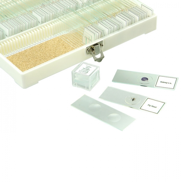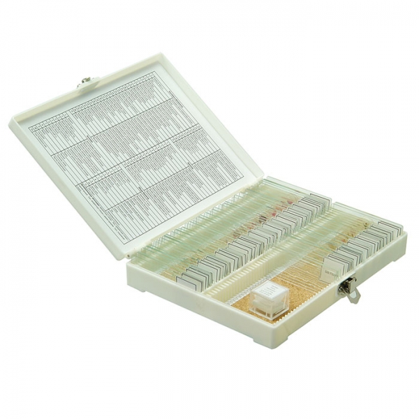 Набор состоит из готовых микропрепаратов в количестве 74 шт., предметных и покровных стекол для самостоятельного изготовления препаратов.