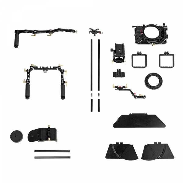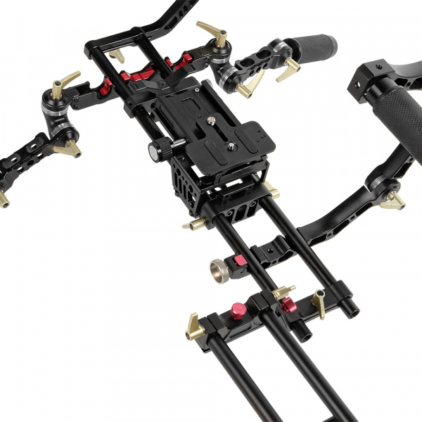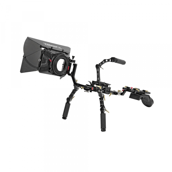 Обвес GreenBean Rig System 05 PRO для камеры Конструкция В качестве основы обвеса используются два алюминиевых суппорта (направляющие) диаметром 15 мм и длиной 440 мм, на которые «навешиваются» все остальные компоненты обвеса: ручки, площадка для камеры, компендиум, опора объектива, плечевой упор. Для удлинения суппортов, в комплекте с ригом идут два дополнительных суппорта длиной 100 мм с двухсторонними винтами. Все элементы обвеса (кроме резиновых накладок на рукоятки и плечевой накладки) изготовлены из алюминиевого сплава на высокоточном CNC оборудовании. Бесчисленное количество положений, в которые можно установить и зафиксировать все элементы обвеса, позволят подобрать оптимальную конфигурацию рига. Все затяжные барашки изготовлены из алюминиевого сплава и имеют храповой механизм. Компендиум Компендиум (9″ х 6″) устанавливается перед объективом и служит в качестве бленды и для установки светофильтров. Металлический светозащитный короб, регулируемый по высоте, имеет три поворотных шарнира для установки светозащитных шторок: двух боковых и одной верхней (козырька). Все шторки в шарнире имеют надёжную винтовую фиксацию. Более того, предусмотрена возможность изменить геометрию боковых шторок для предотвращения засветки при работе с объективами с разным фокусным расстоянием. Геометрия козырька — неизменяемая. За светозащитным коробом находятся кассета для двух светофильтров. Светофильры (размер 4″ х 4″) устанавливаются в оправу, фиксируются в ней подпружиненным штифтом и вместе с оправой устанавливаться в кассету. Одна оправа (ближняя к камере) имеет возможность вращаться вокруг своей оси, таким образом, можно установить поляризационный фильтр. Фиксация оправ в кассете — винтовая. Смена объектива осуществляется без снятия компендиума с суппортов. Поворотный шарнир позволяет просто откинуть компендиум в сторону на угол до 180°. С обратной стороны компендиума закреплено резиновое кольцо с отверстием под объектив камеры диаметром 86 мм (допустимый максимально возможный диаметр объектива составляет 131 мм — со снятым резиновым кольцом). Ручки В комплекте обвеса предусмотрены ручки: нижняя (с двумя рукоятками) и верхняя захват-ручка. Ручки быстросъёмные, установить их возможно на левую или правую сторону. Фиксация ручек на суппортах винтовая. Для удобства хвата, ручки имеют резиновые рукоятки. Для облегчения конструкции, нижняя ручка имеет отверстия и проточки. Нижние ручки также можно установить на 19 мм суппорта. Для установки дополнительного оборудования на риг, верхняя захват-ручка снабжена 12-ю отверстиями с резьбой 1/4″. Изменить направление рукояток и подобрать их оптимальное положение позволяют шарниры, находящиеся на плечах ручек. Шарниры ручек имеют зубчатое соединение, что полностью исключает люфт и прокручивание при работе. Установка камеры Установка камеры производится на базу (baseplate) с помощью быстросъёмной площадки. База может передвигаться вдоль суппортов и фиксироваться в выбранном положении на два винтовых фиксатора. Её также можно отрегулировать по высоте, для этого в комплекте предусмотрены шестигранные ключи. Быстросъёмная площадка Т-образной формы устанавливается в базу и фиксируется на винтовой фиксатор. Для предотвращения её выпадения из базы предназначен подпружиненный предохранитель с кнопкой. Х