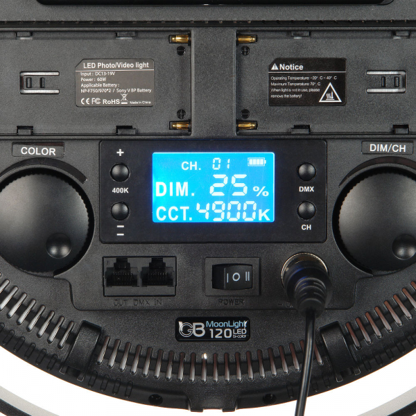 Осветитель светодиодный GreenBean MoonLight 120 LED bi-color Мощный светодиодный осветитель GreenBean MoonLight 120 LED bi-color - круглая световая панель с изменяемой цветовой температурой. Источники света — 600 ярких SMD светодиодов с высоким уровнем цветопередачи (CRI более 95). Максимальная мощность — 67 Вт. В отличие от традиционно используемых софтбоксов, осветитель GreenBean MoonLight имеет абсолютно круглую матовую (через которую не видны излучающие светодиоды) поверхность, малые габариты и может создавать красивые круглые блики на глянцевых отражающих поверхностях. В осветителе используется две группы светодиодов с температурой 3200 К и 5600 К, каждая номинальной мощностью 60 Вт. Электрическая схема блока питания осветителя ограничивает общую мощность световой панели величиной 67 Вт. Установив (зафиксировав) необходимую мощность панели (максимум 67 Вт), пользователь может плавно менять цветовую температуру. Регулировка мощности бесступенчатая — от 10 до 100% Конструкция Корпус осветителя изготовлен из ударопрочного ABS пластика, на передней части корпуса расположен белый молочный светорассеиватель диаметром 28 см. На задней части корпуса расположены элементы управления осветителем, LCD экран с подсветкой, разъёмы DMX тип RJ45, разъём питания, разъёмы для установки аккумуляторов и тумблер питания. Протокол DMX-512 позволяет подключать и объединять в группы не только осветители GreenBean MoonLight 120 LED bi-color, но и различные устройства других производителей (прожекторы, осветители и т.д.) к пульту управления (существуют и беспроводные передатчики и приемники для управления по DMX). Сверху на корпусе расположен «холодный» башмак для установки аксессуаров (приобретаются отдельно): например, микрофонов, держателей для смартфонов и т. д. . Лира осветителя изготовлена из алюминиевого сплава. Осветитель может наклоняться на лире на угол 180° и фиксироваться в этом положении с помощью двух винтовых зажимов по обеим сторонам. Установка осветителя осуществляется на стандартную стойку со шпиготом 5/8 дюйма; предусмотрена возможность горизонтальной установки лиры осветителя. Фиксация лиры на стойке — винтовая. Активная система охлаждения с бесшумными вентиляторами не создаёт помех при звукозаписи и допускает длительную работу осветителя без необходимости делать перерывы во время съёмки для его «остывания». Дистанционное управление Для дистанционного управления осветителем, в комплекте с ним предусмотрен пульт 2.4 ГГц. С помощью него можно настраивать мощность и цветовую температуру, а также выбирать канал управления или полностью отключать питание прибора Текущие параметры работы отображаются на экране. Питание пульта осуществляется от 2-х батареек типа «ААА». Два варианта питания осветителя В студии: комплектный блок питания с сетевым кабелем. На выезде: возможно подключение аккумуляторов NP-F (питание осуществляется только от двух аккумуляторов одновременно) или V-mount. Для длительной автономной работы, можно установить все три аккумулятора. Аккумуляторы NP-F и V-mount приобретаются отдельно. Выбор источника осуществляется трёхпозиционным тумблером на корпусе осветителя. Сумка-чехол Для хранения и транспортировки в комплекте предусмотрена сумка-чехол на молнии.