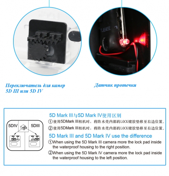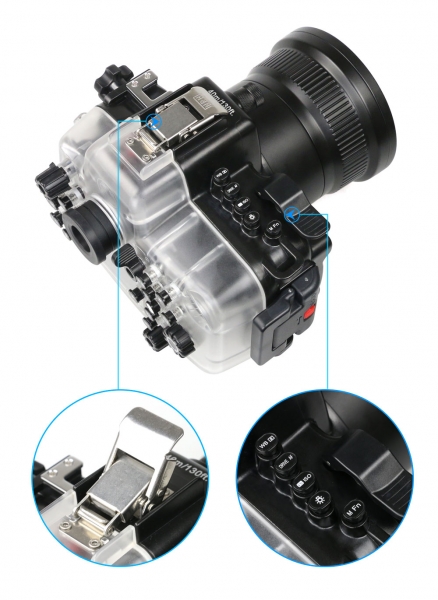 Электронный порт позволяет подключать внешние вспышки. Имеет датчик протечки со звуковым и световым сигналом. На боксе также установлен оптический видоискатель.