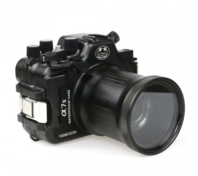 Подводный бокс (аквабокс) Sea Frogs для фотоаппарата Sony Alpha A7II (16-35 / 24-70 / 28-70 мм) алюминий Подводный бокс выполнен из цельного блока твердого алюминиевого сплава. Фрезеруется на высокоточных станках и анодируется с учетом использование в морской воде. Этот ультра-прочный корпус имеет глубину погружения 100 метров в соленной воде. Новые сверхпрочные замки задней крышки бокса. Бокс имеет возможность сменных портов под разные объективы. Байонет Type2A В комплекте поставляется портом для объективов SEL 16-35mm, SEL 24-70mm. Он имеет датчик протекания со звуковым и световым сигналом, электронный порт для подводной вспышки. Продуманная эргономика позволит Вам с удобством использовать все функции цифрового фотоаппарата.