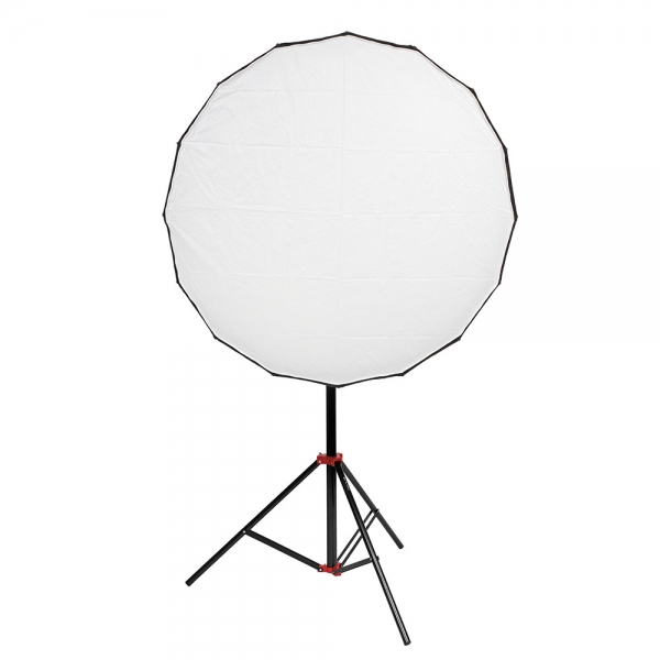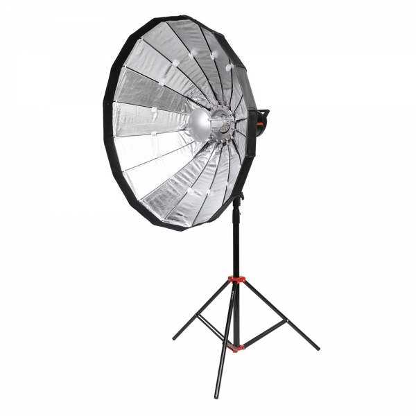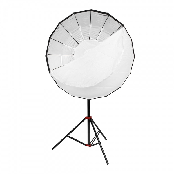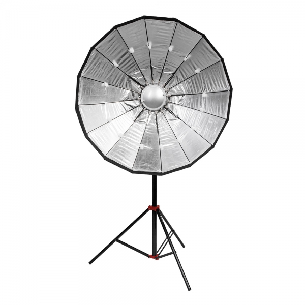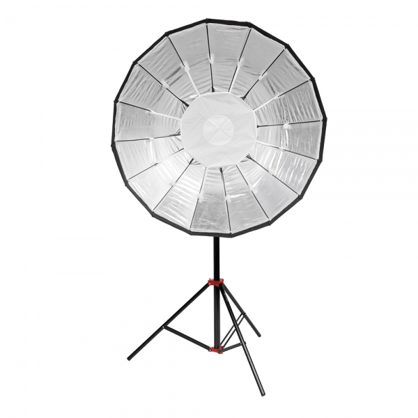 В комплект входит металлический дефлектор, тканевый внутренний рассеиватель с серебристой вставкой, внешний рассеиватель на липучке и сотовая насадка с ячейками 4х4 см. Тарелка быстро подготавливается к работе, сборка занимает несколько секунд – достаточно просто разложить спицы и установить необходимую насадку. Установленную на приборе тарелку можно поворачивать на 360 градусов, выбранное положение фиксируется винтом на основании с внешней стороны.