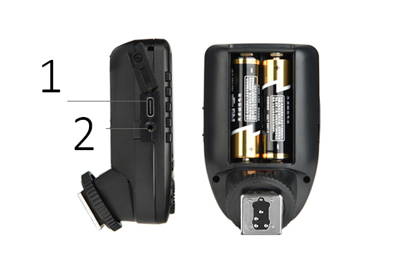 Большой ЖК дисплей, 5 кнопок групп и 4 функциональных кнопки обеспечивают удобство манипуляций. Кнопки групп (1), Функциональные кнопки (2) Обновление прошивки через USB разъем типа С. Беспроводная синхронизация через гнездо для синхрокабеля 2,5мм. USB разъем тип C (1), Гнездо для синхрокабеля 2,5мм (2) *2 батарейки АА Большая портативность Xpro-F – его вес всего 80 г.
