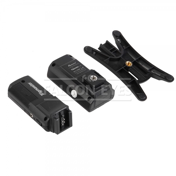 Приемник подключается к накамерной вспышке с помощью разъема «горячий башмак» или к студийной вспышке синхрокабелем из комплекта, работает двух батареек типа ААА и «запускает» вспышку при получении сигнала от передатчика. Резьба 1/4" позволит закрепить приемник с вспышкой на опоре (стойка, штатив