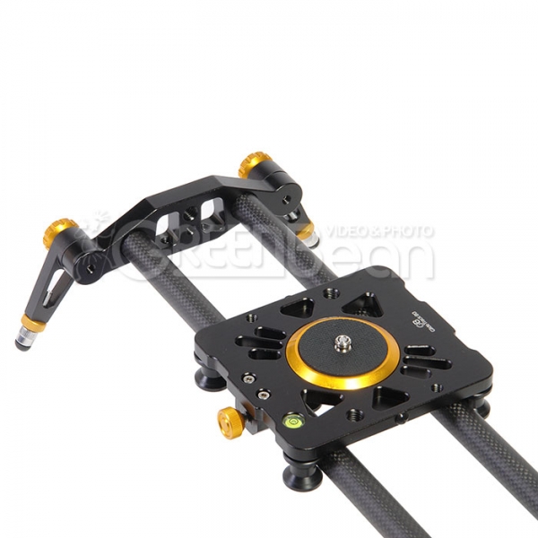 Слайдер GreenBean Glide Track 80 Green Bean Glide Track 80 - легкий и прочный слайдер (глайдтрек) с карбоновыми направляющими для камер весом до 6 кг. Применяется в видеопроизводстве для съемки рекламных роликов, презентационных фильмов, свадебных клипов и другой видеопродукции. Слайдер предназначен для съемки с движущейся точки, установленная на каретке камера плавно передвигается по рельсовым направляющим. Прецизионно изготовленные ролики обеспечивают исключительно плавное движение каретки. Каретка опирается на направляющие с помощью 4 внешних роликов и 2 регулируемых внутренних роликов на подвижном основании, такая конструкция позволяет выбрать зазоры для полного устранения люфта. Опорные ролики изготовлены из прочного полимерного материала. На оси каждого ролика находятся два радиально упорных безлюфтовых подшипника повышенной грузоподъемности, которые не требуют дополнительной смазки. На каретке находится винт диаметром 1/4" (в комплекте переходник 3/8") и отверстия с резьбой диаметром 1/4" и 3/8" для установки вспомогательного оборудования. Сверху на каретке расположен пузырьковый уровень, который поможет выставить слайдер по горизонту. Винтовой фиксатор позволит зафиксировать каретку в определенном положении, а резиновые упоры на торцах каретки предотвратят жесткие удары в крайних положениях. На направляющих снизу в центре расположена монтажная площадка для установки на штатив, на пластине имеются 2 резьбовых отверстия диаметром 1/4" и 3 отверстия диаметром 3/8". Также возможна установка на два штатива, для этого снизу на торцах слайдера имеются отверстия с резьбой диаметром 1/4" и 3/8". Ножки слайдера регулируются по высоте и поворачиваются на 360˚ вокруг оси крепления. Ножки соединяются с основанием с помощью зубчатой муфты, препятствующей проскальзыванию. В узле крепления ножки находится прижимная пружина, если ослабить зажим, то ножка не потеряет своего положения, но позволит отклонить ее ступенчато через зубчатый механизм. На концах ножек расположены вывинчивающиеся на 15 мм наконечники с резиновой опорой.