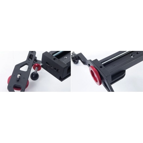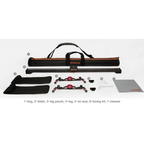 Шершавое покрытие проходит термическую обработку и тщательно шлифуется. Такая технология обработки помогает добиться максимально гладкой поверхности рельс. После прохождения термической обработки поверхность рельс становится зеркально гладкой. В дополнение ко всему, двойные подшипники, которыми оборудованы модели слайдеров К3 и К5, с косым примыканием обеспечивают максимально точное, плавное и бесшумное передвижение камеры по рельсам. Вертикальное положение: При установке слайдера на штатив в вертикальном положении необходимо использовать штативную или панорамную головку. Также возможна установка без использования вышеупомянутых устройств. Установка слайдера в вертикальном положении позволяет вести съемку из нижнего ракурса, что является одним из важнейших преимуществ данной модели перед современными аналогами. Слайдер также можно закрепить вертикально при помощи винтов 1/4" и 3/8", отверстия для которых расположены с обеих сторон слайдера. Диагональное положение: Штатив или головку можно прикрепить к нижней части рельс слайдера. Слайдер Konova совместим с головкой или адаптером 3/8"- 5/8" (поставляется отдельно). Возможна установка камеры под любым углом. Высота ножек регулируется, что позволяет установить слайдер под наклоном. При необходимости рельсы с легкостью снимаются с ножек. Горизонтальное положение: Далеко не все случаи требуют передвижения камеры именно слева направо, однако же, такое положение слайдера используется наиболее часто. Такое положение позволяет приближать и отдалять камеру от предмета съемки. Позволяет добиться высочайшего качества результата и воплотить все творческие идеи в реальность. Отверстия для крепежных винтов 1/4" и 3/8" позволяет установить дополнительное оборудование для съемки на нижней части слайдера. Штатив очень удобен для установки слайдера в горизонтальном положении. Ножки: Ножки позволяют прочно и надежно зафиксировать слайдер на любой поверхности. Оборудованы мягкими резиновыми наконечниками, которые защищают поверхность от царапин и обеспечивают более прочную установку слайдера. Положение каждой ножки регулируется отдельно: ее можно установить в любой позиции под любым углом, что также является преимуществом и отличием данной модели от аналогов. Ножки очень легкие, а их установка занимает считанные минуты. Надежная фиксация камеры: Слайдер данной модели прочно и надежно фиксирует камеру, что предотвращает появление малейшей тряски в кадре. Сам слайдер также не вибрирует во время работы. Существует два способа предотвратить возникновение вибрации. Первый способ заключается в регулировке плотности закручивания винта, что в свою очередь регулирует натяжение пружины. Второй способ предполагает использование гаечного ключа, который поставляется в комплекте с данной моделью и является более удобным и точным. Масляные сальники: Масляное покрытие наносится на шершавую поверхности, что необходимо для ее максимального сглаживания. Процесс так называемой сверхтонкой обработки очень важен для беспрепятственного и плавного скольжения камеры по рельсам слайдера. В дополнение, двойные подшипники с косым примыканием делают движение еще более плавным и бесшумным. Линейка: В комплекте поставляется 2 линейки с клейкой оборотной частью. Устройство позволяет точно замеря