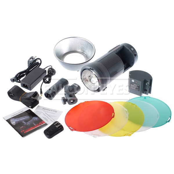Вспышка студийная Falcon Eyes GT-480 Вспышка GT480 (байонет Bowens) предлагает владельцу уникальное сочетание характеристик, мобильности и привлекательной цены. GT480 выполнена в форм-факторе классического студийного моноблока, но несет «на борту» емкий аккумулятор, дающий возможность получения ультракоротких импульсов, ранее доступных только генераторными комплектам. Из особенностей отметим встроенный 16-канальный приемник радиосинхронизатора. В комплекте с GT480 идет управляющий радиосинхронизатор, устанавливаемый в горячий башмак вашего фотоаппарата. Для экономии заряда батареи, светодиодный пилотный свет (5 Вт) автоматически отключается через 30 сек. после включения. Световой поток мощного светодиода примерно равен 75-ваттному галогенному аналогу. Вспышка GT-480 использует импульсную лампу RTS12-4530GT. Наличие аккумулятора и особенности элементной базы, наделяют GT480 преимуществами, недоступными классическим студийным вспышкам. Это, например, генерация ультракоротких импульсов. В режиме FP моноблок выдает импульсы длиной 1/11000, 1/9000, 1/6000, 1/4000 или 1/2000 сек. В режиме стробоскопа вспышка производит до 25 импульсов в секунду (5-10-15-20-25) . Что это дает фотографу? При выдержках от 1/2000 до 1/4000 вспышка обеспечивает достаточную мощность и длину импульса для «заморозки» капель воды при съемке в аквастудии и многое другое. В режиме стробоскопа можно делать серию кадров, фиксируя динамику модели. Классические студийные моноблоки из-за существенно более долгого времени перезарядки в аналогичной ситуации позволят сделать только один кадр. Аккумулятор АС-GT480 размещен в задней части прибора, сверху. Извлекается очень просто — нажимаем две кнопки и тянем батарейный блок на себя. Емкость батареи 6000 mAh. Этого хватает примерно на 680 вспышек при полной мощности. В комплекте поставляется зарядное устройство. Батарею можно заряжать только вне вспышки. Возможна работа от сети (сетевой адаптер AC-220GT приобретается отдельно). Материал корпуса - металл с покрытием SoftTouch. В верхней части моноблока размещена выкидная (подъемная) ручка. В нижней части корпуса вместо традиционного крепежного устройства расположено гнездо с винтовым креплением. В него устанавливается крепежное устройство для установки на стойки с наконечником 5/8" или эргономичная «пистолетная» рукоятка, которая благодаря рельефу под пальцы и изгиб ладони хорошо ложится в руку. В нижней части рукоятки размещена резьба 1/4" с адаптером 3/8" для крепления на фотоштативы. Кнопка включения-выключения размещена перед рукояткой. В комплекте идет наплечный ремень с винтовым креплением к специальной резьбе в корпусе вспышки. Блок с кнопками управления вспышкой и ЖК-дисплеем размещен на тыльной стороне устройства. Для охлаждения моноблока справа и слева на корпусе размещены вентиляционные отверстия, закрытые металлической сеткой и защитными решетками. комплектацию входят: рефлектор, рассеивающие фильтры (желтый, зеленый, красный и синий). Сфера применения — практически все виды выездных съемок, от корпоративной фотографии до пленэра. При наличии ассистентов — репортажная фотография, включая спортивную или свадебную. Дополнительно приобретаемый адаптер AC-220GT позволяет использовать вспышку в студии от сети 220В.