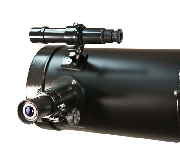 На трубе телескопа установлен оптический искатель 6х30, использование которого существенно облегчает наведение на объекты. Большое поле зрения позволяет быстро найти нужный объект на небе, а окуляр с перекрестием дает возможность точно навести телескоп в заданную точку. Искатель крепится с помощью двух регулировочных винтов и одного подпружиненного упора – это облегчает его настройку и в то же время обеспечивает надежное сохранение параллельности оптических осей искателя и телескопа.