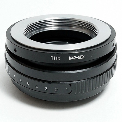 Tilt Адаптер M42 - Sony E NEX адаптер с наклоном оптической оси, предназначенный для установки объективов с креплением M42 на фотоаппараты системы Sony E NEX (кроме полнокадровых). Управление диафрагмой и фокусировкой происходит вручную, нет возможности использования автофокусировки, все настройки производятся на объективе. Переходник имеет 8 степеней наклона (от 0 до 8 градусов). Адаптер превращает любой обычный объектив в объектив с наклоном, который используется для коррекции глубины резкости и оптических искажений.